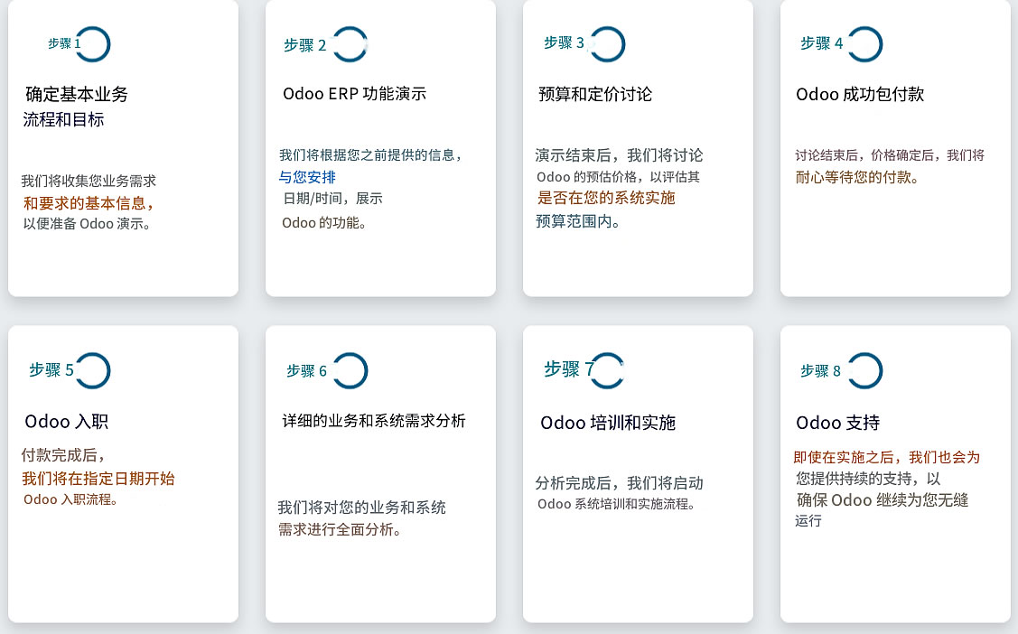 我们为客户提供全面的Odoo实施服务,包括业务需求分析、Odoo系统演示、系统上线和培训。